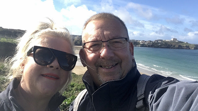 We are going to take the coastal path out to Watergate Bay, the 2 miles across the cliff top gave us some spectacular sea views and although very windy was a great walk, as we walked down the path into Watergate bay it bought back so many wonderful memories of our time here over the past 40 or so years, we called into the 'Chequers' now called Wax for a pint or two and sat out on the terrace with views over the bay.